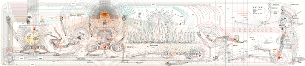 작가의 작품 <육인가족도>는 6명의 가족이 모여 어머니가 키우신 알로에를 몸에 바르고 있는 내용과 가족이 모이면 주로 하는 이야기들, 과거에서부터 이어진 관계 등을 담았다.2 하지만 단순히 이미지만 보았을 때는 이것이 어머니를 중심으로 한 가족에 대한 이야기라는 느낌보다는 기계가 작동하는 원리를 담은 설명서처럼 보인다. 그렇지만 도면이나 기계 설명서에 익숙하지 않은 사람이라도 작품 속에 적혀있는 ‘love’라는 단어를 발견한 순간 이것이 이성적이고 객관적인 이야기를 하지 않는다는 것을 눈치챌 수 있다. 계산적이고 차갑게 느껴지는 이미지 속에 너무나도 따뜻한 단어를 발견하는 순간 웃음을 짓게 된다. 놀랍게도 한 가지의 따뜻함을 발견함과 동시에 종이의 색마저 미묘하게 따뜻하다고 느껴지기도 한다. 작은 따뜻함이 작품 전체를 감싸안는 것이다.